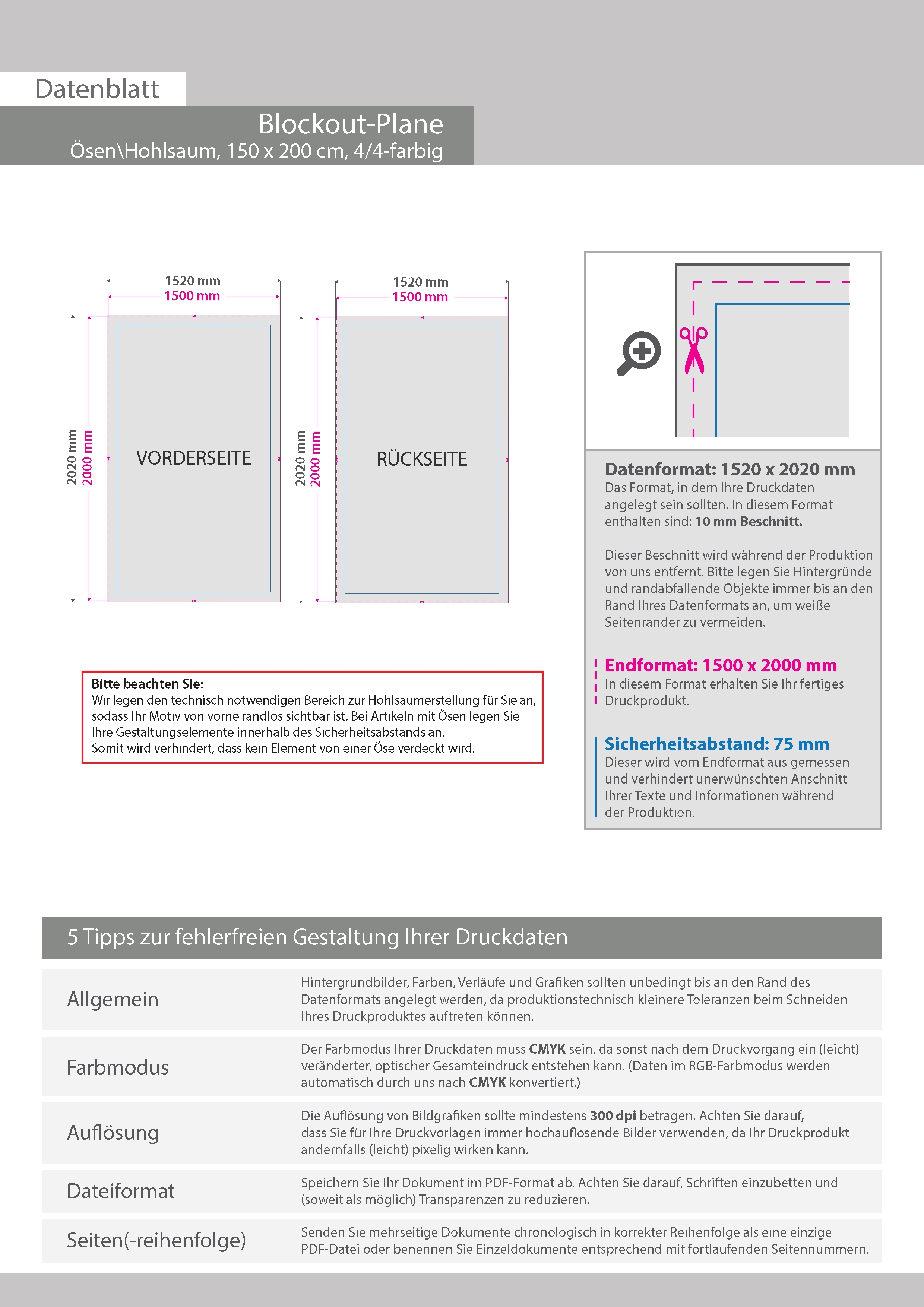 Hochwertige Blockout-Plane 150 x 200 cm, 4/4-farbig bedruckt, Ösen im Abstand von 50 cm oben und unten