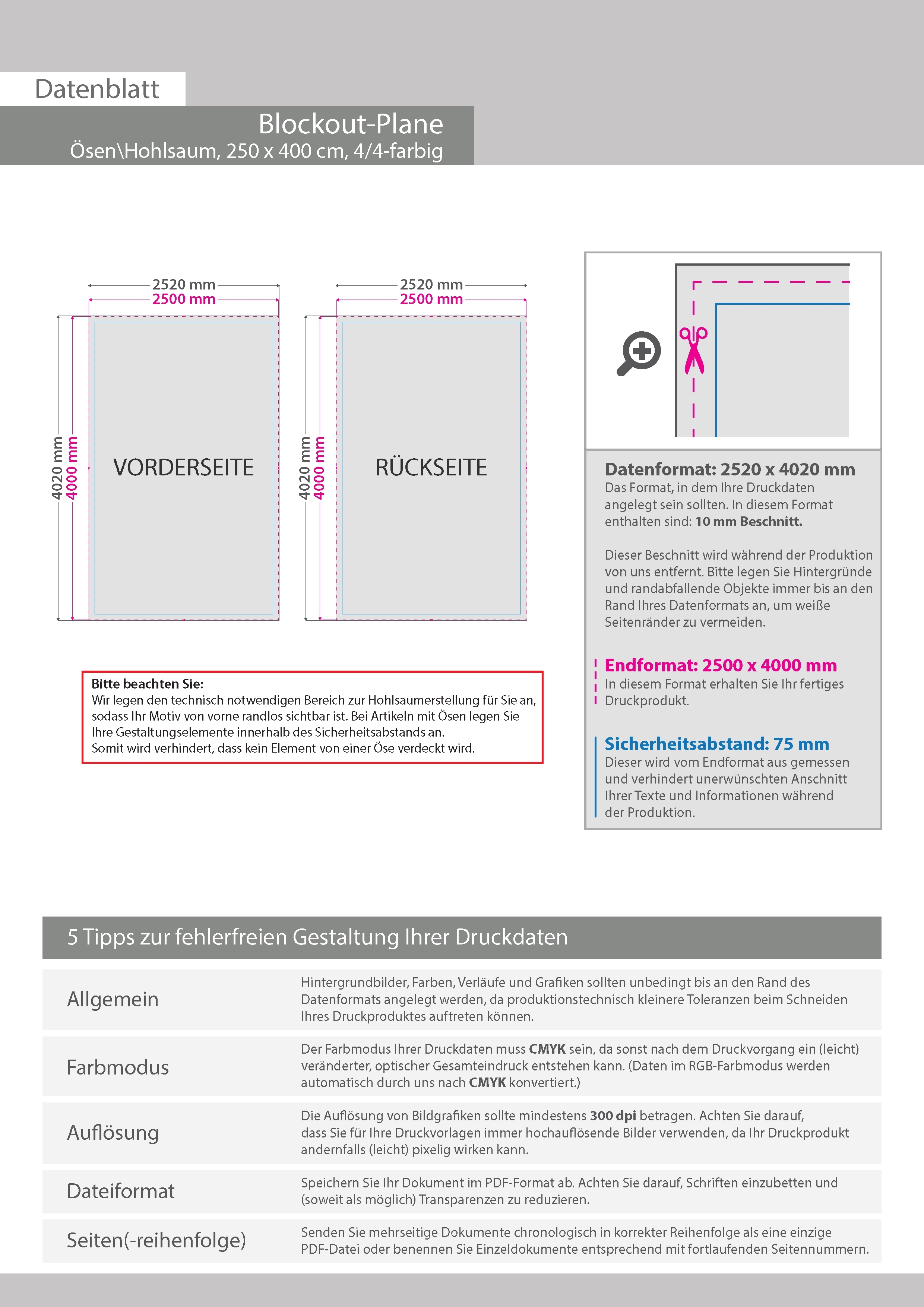 Hochwertige Blockout-Plane 250 x 400 cm, 4/4-farbig bedruckt, Ösen im Abstand von 50 cm oben und unten
