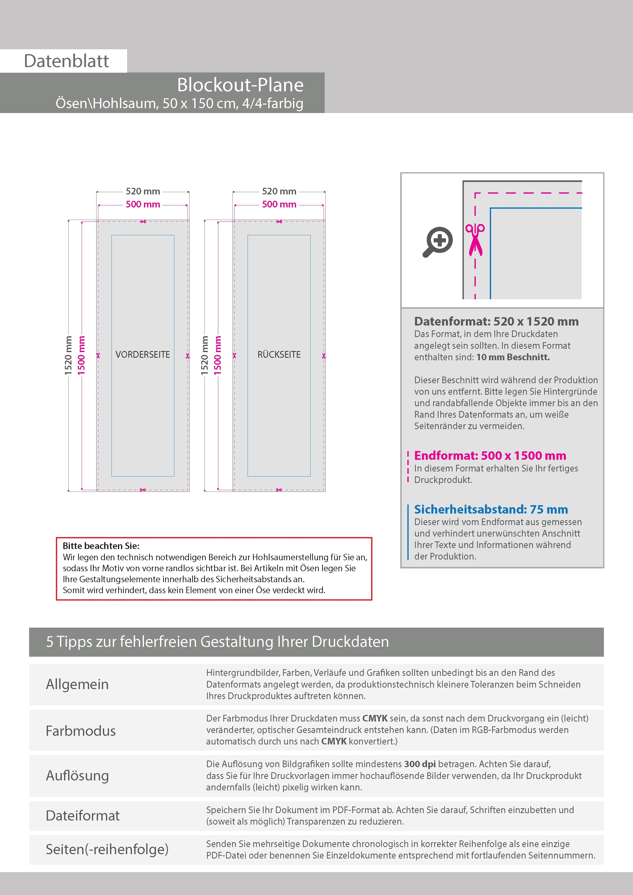 Hochwertige Blockout-Plane 50 x 150 cm, 4/4-farbig bedruckt, Hohlsaum links und rechts (Durchmesser Hohlsaum 3,0 cm)