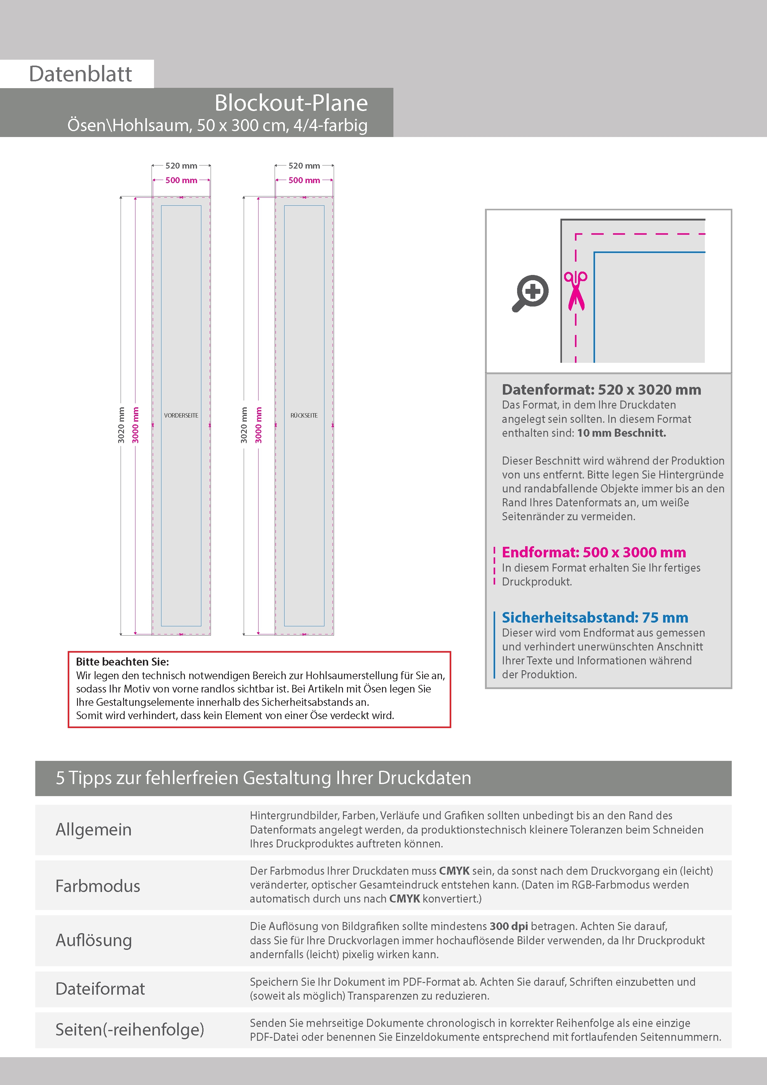 Hochwertige Blockout-Plane 50 x 300 cm, 4/4-farbig bedruckt, Hohlsaum links und rechts (Durchmesser Hohlsaum 3,0 cm)