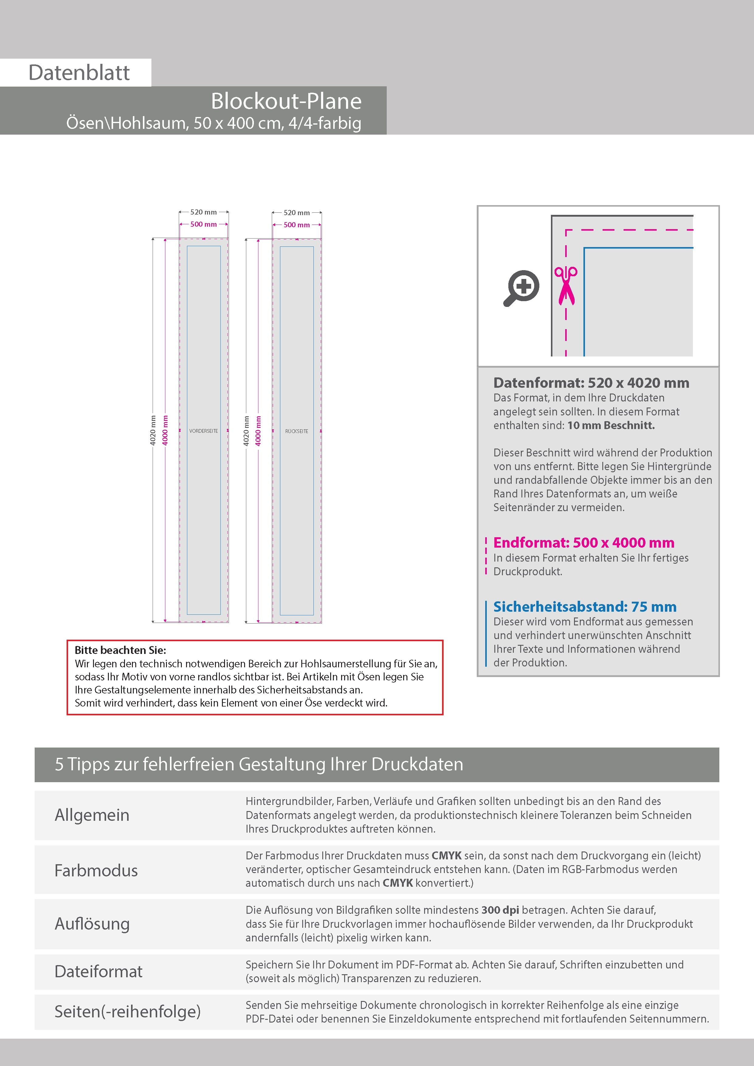 Hochwertige Blockout-Plane 50 x 400 cm, 4/4-farbig bedruckt, Hohlsaum links und rechts (Durchmesser Hohlsaum 3,0 cm)