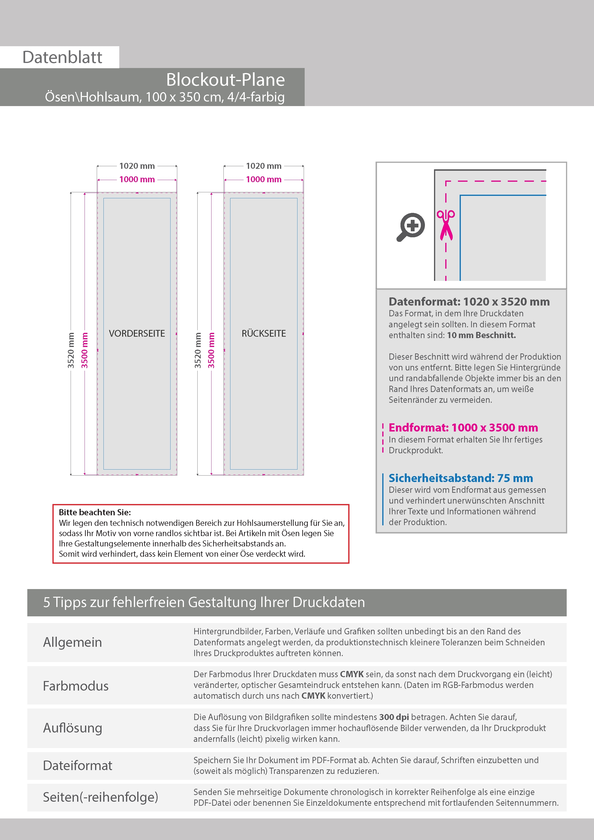 Hochwertige Blockout-Plane 100 x 350 cm, 4/4-farbig bedruckt, Hohlsaum links und rechts (Durchmesser Hohlsaum 3,0 cm)