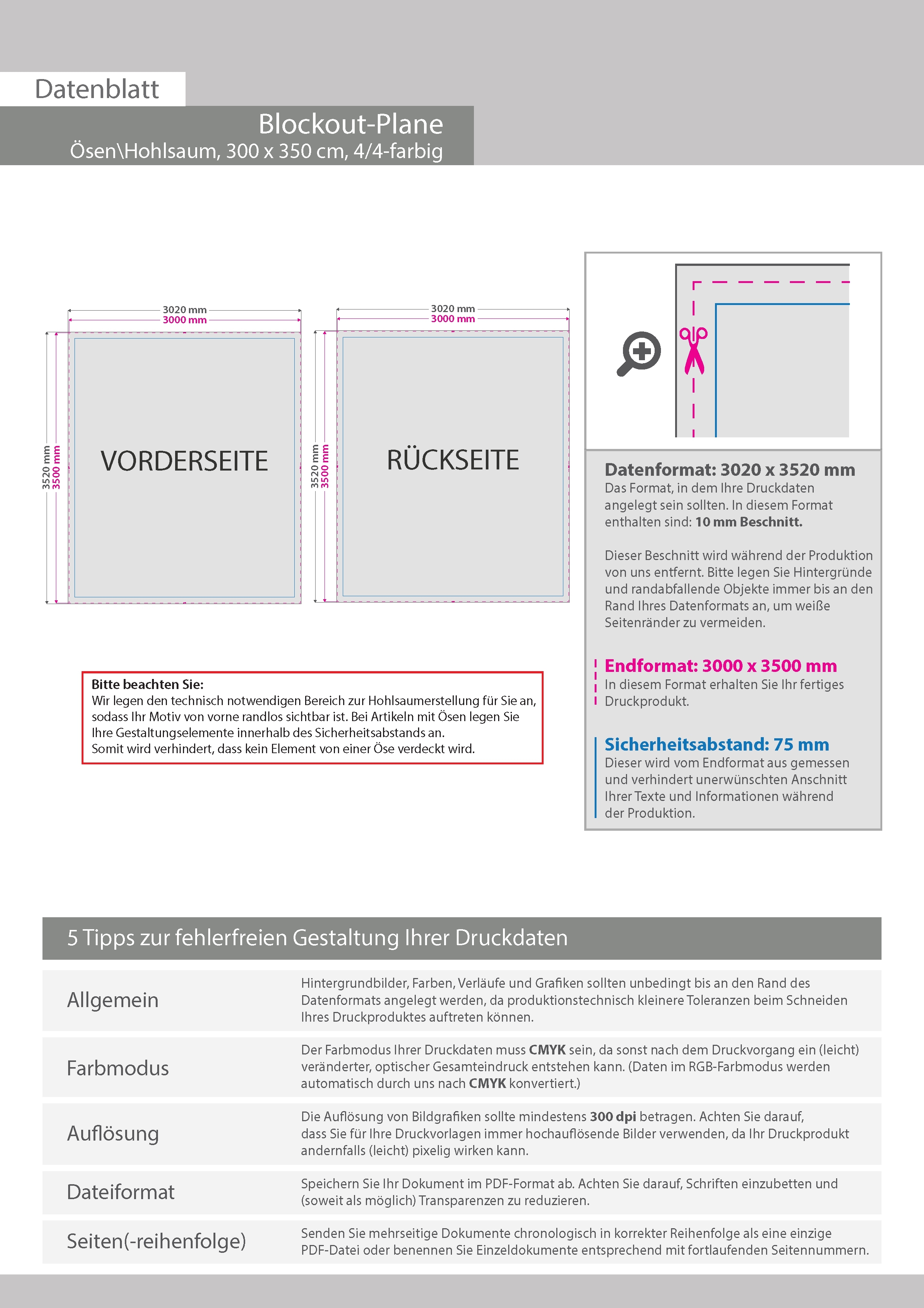 Hochwertige Blockout-Plane 300 x 350 cm, 4/4-farbig bedruckt, Hohlsaum links und rechts (Durchmesser Hohlsaum 6,0 cm)