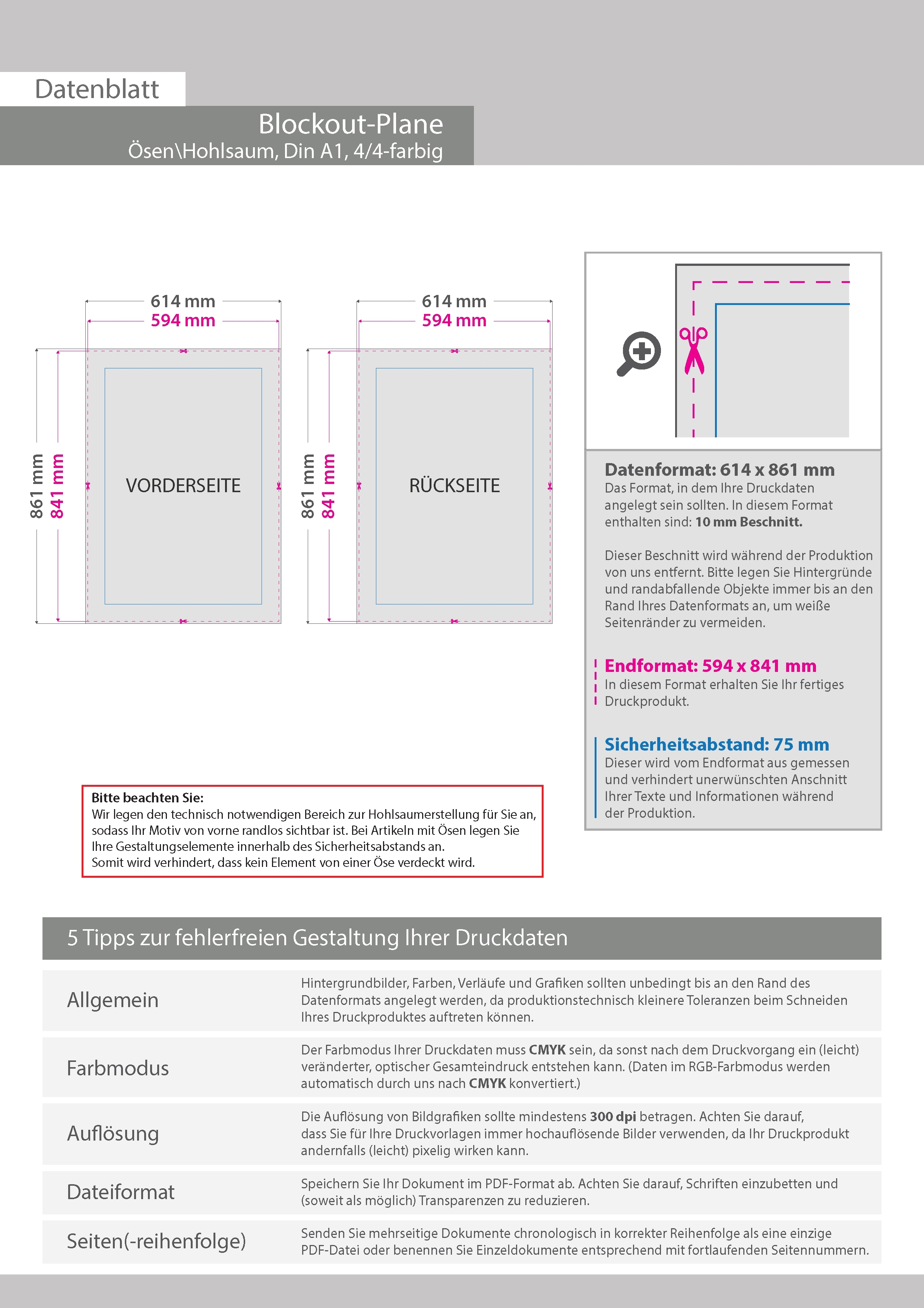 Hochwertige Blockout-Plane DIN A1 (59,4 x 84,1 cm), 4/4-farbig bedruckt, Hohlsaum oben und unten (Durchmesser Hohlsaum 3,0 cm)